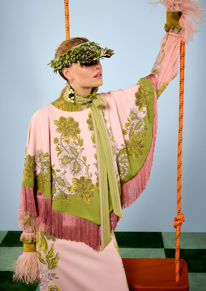 REVERSIBLE MINI PONCHO TOP WITH FRINGES / Envers Satin - Swathe Placée Pink CERERE BLOUSE PLACÉE / Silk Chiffon - Swathe Placée Green