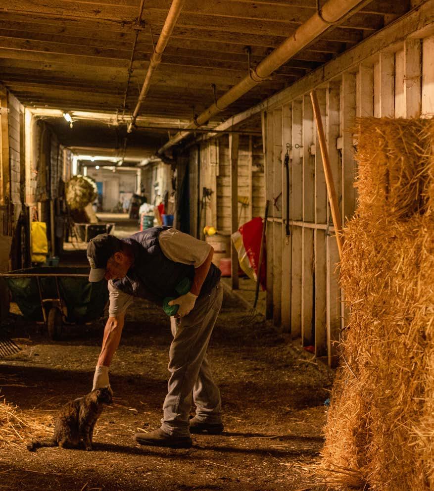 Nicolas Hernandez, a horse groomer at Golden Gate Fields, greets his cat Frosty at the beginning of his shift on June 6, 2024. Hundreds of migrant workers and their families living in the backstretch of the track in Berkeley, Calif., moved out of the area to find new work, homes, and schools for their children after the track closed on June 19, 2024.