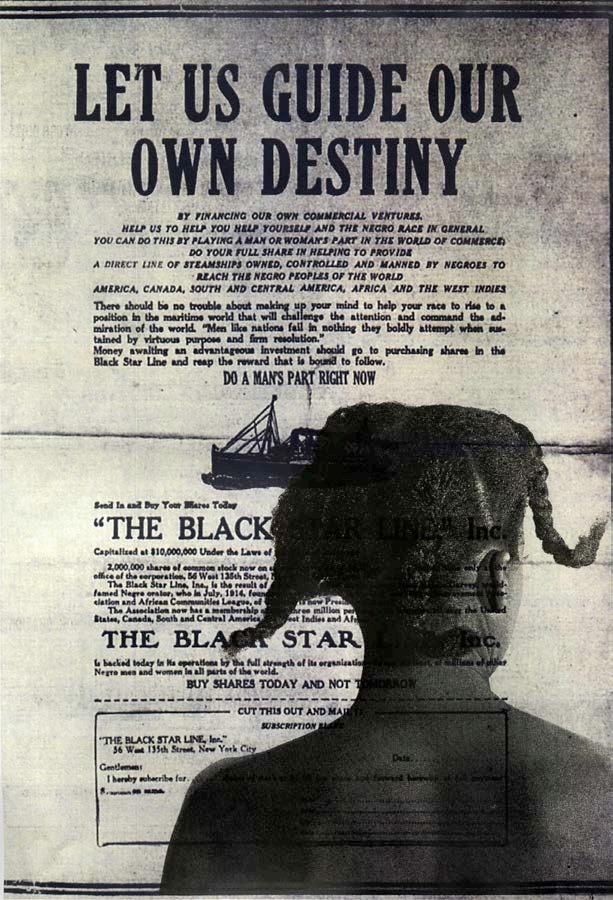 Through international archival research, Adama Delphine Fawundu has amassed dozens of found newsprint stories, reproductions of paintings, advertisements, and more, ranging from Antebellum American South to the mid-20th century. These documents highlight historical records of trauma, hope, resistance, and the brilliance of oppressed people. According to Fawundu, she intervenes in these moments by transposing herself onto the print, “simultaneously bearing quantum witness and acting as a photopsychic intercessor,” with attention to how our perceptions of history shape how we engage in the present.