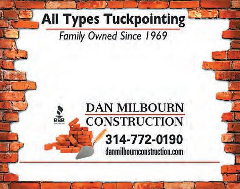 Trimming, deadwooding, reduction, removals, stump grinding. Year round service, insured. Call Michael Baumann 636-375-2812 for a free estimate & property inspection. You'll be glad you called! Yucko's Your Poop Scoop 'n Service Free Estimates - No Contracts 314-770-1500 www.yuckos.com Wanted Trees Customized Pet Care By Creature Comforts Great & Small. 13 Years in Business Domestic & Exotic Pets Mention Ad For 10% Discount Call Paul Flotron Today 314-775-7107 CreatureComfortsGreatnSmall.com Pet Services JC PAINTS Interior/Exterior Painting Reliable, Reasonable, Clean, Insured. Call John now for a Free Estimate! 314-703-2794 jcpaintssbcglobal.net Brick&stone,customcolorpoolcaulking, drive-waypowerwashing&caulking. Allcreditcardsaccepted.Nodeposit required,A+BBBrating.Angie’sList2011, 2017and2020ServiceAwardRecipient. NoJobTooSmall • Residential,Commercial Insuredforyourprotection Painting Services Tuckpointing