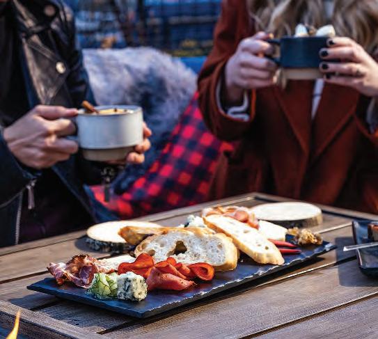 BookingthePrivateChalet Roomprovidesaccesstothehotel’s temporaryrooftopcurling rink, outdoorloungeseatingunderthe twinklelightsandaroundfirepits andheatlamps,twobottlesof sparklingwine,apailof10beers andcomplimentaryparking. Additionalfoodandbeverages areavailableforpurchasefrom aspecialtymenu.