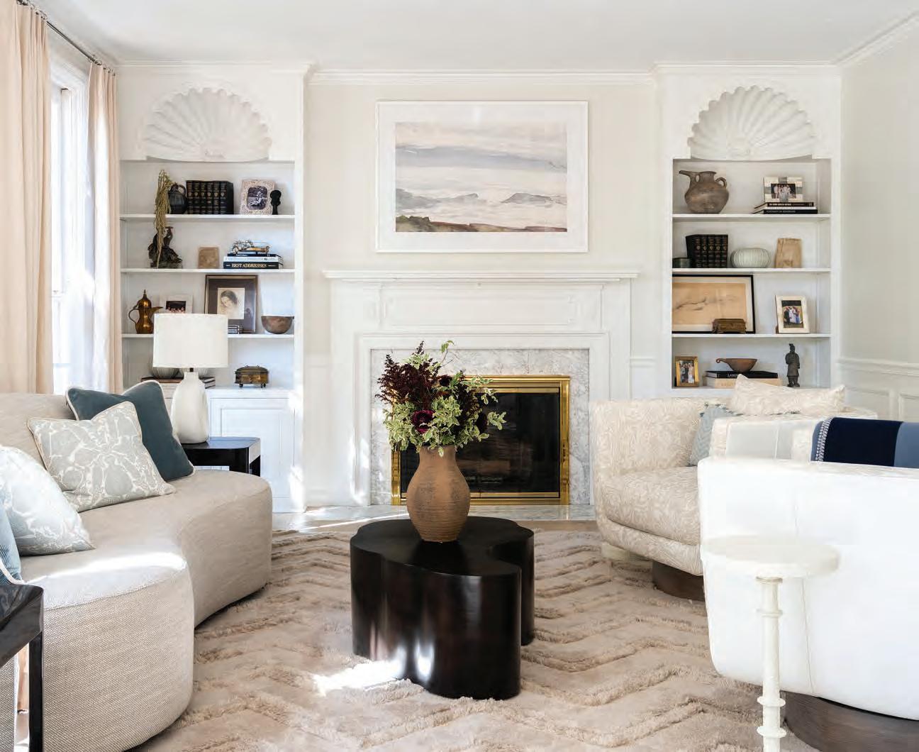 Additionally,theclienthadartifactshermotherfoundand purchasedduringhertravels. Theearthy,texturedpotteryand sculpturesperfectlyappointtheabode, fromaccentingtheliving roomcoffeetabletoadorningthesittingarea’sbookshelves.