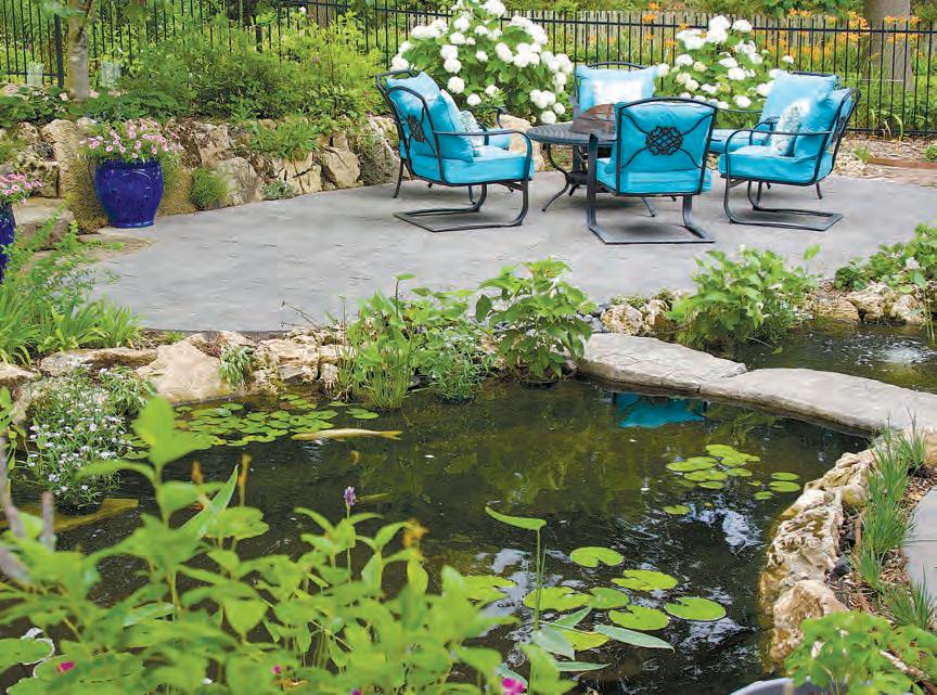 “ esightsandsoundsof owingwater,alongwith birds,pollinators,koiandbeautifulplantsreducestressand boostyourmood,”saysGinnyMueller,watergardenenthusiastandPond-O-Ramamarketingandpublicitychairwith theSt.LouisWaterGardenSociety.“ ere’sareasonwhy peopletendtovacationnearbodiesofwater–itrelaxes, soothesandentertainsus.Similarly,watergardeningbrings