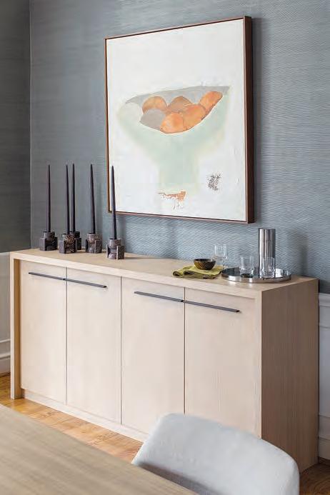 Anothercentralphilosophyofthefirmismixingnewer elements, likeupholstery,withvintageorantiqueobjects. Thus, thefinishedproject alsoshowcasesthehomeowner’sloveofart. “Theclienthasaphenomenalartworkcollection,andshedoes artworkherself, sowepickedthroughherdifferentpiecesand utilizedthemthroughoutthespace,”Krichevskyexplains.
