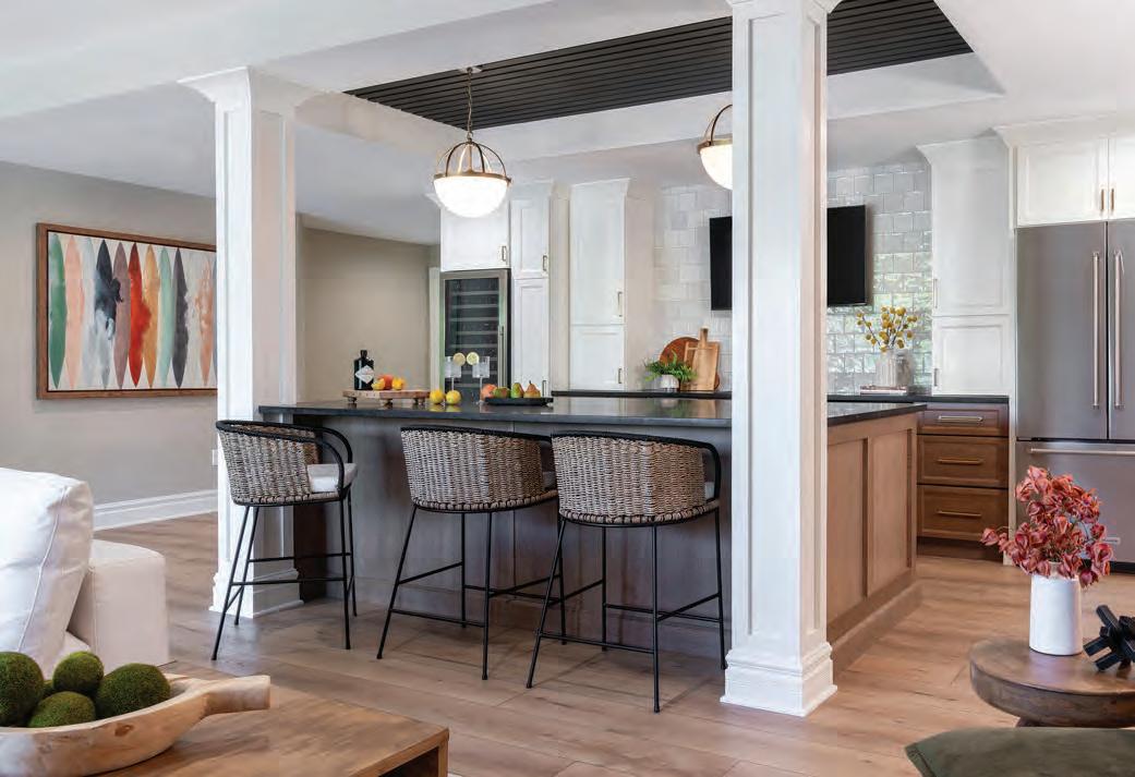 Theexpansiveproject entailedturningthefullfirst-floor–a kitchen,livingroom,sittingareaandpowderroom–intoafunctional, beautifuldesigntoaccommodaterelaxingdaysforthecoupleand welcomingvisitsfor theiradult children andgrandchildren,explains MariaHogrefe,C&M co-founderandprincipaldesigner.