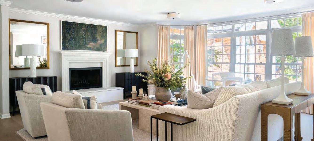 Tomakeeachpieceoftheproject asuniqueastheclient–the homeownerisnotablynotafanofloudpatternsandprints– C&M carriedtheneutral color schemeandnatural,textured elements throughoutthemainlevel.Inthekitchen(picturedonthecoverof thismagazine), brightwhitecabinetrysurroundsagenerouswhite marble-topped islandwithcomfy,cream-colored chairs.