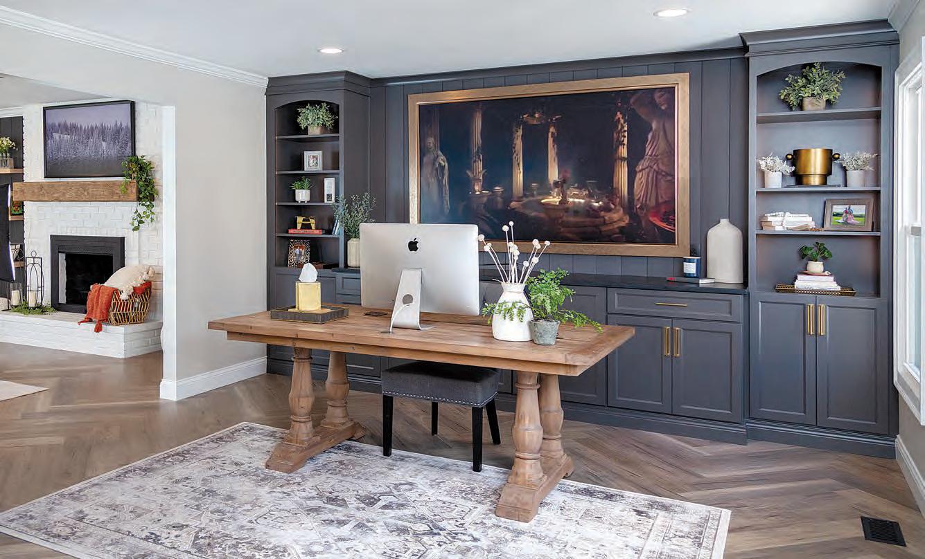 JennyRausch,owneranddesignerat KarrBick Kitchen andBath,recommends consideringyourpersonal workstyle to createaspacethatencouragesproductivity. Sheasks, “Whatdistractsyou? Whathelps you focus? Doyou needquiet forcalls? Do you liketolookatthe wallor outintothe room? Howmuchworkspacedoyou need? Doyou standalot? Howmuchstoragefor paper,ifany,doyou need? enyou can