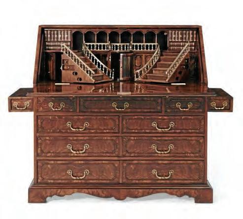 The eye-catching interior compartment of the Grand Staircase fall-front desk from Theodore alexander is outfitted with faux books, hidden drawers, and a miniature double staircase. The bureau is part of the althorpe collection. shubertfurniture.com