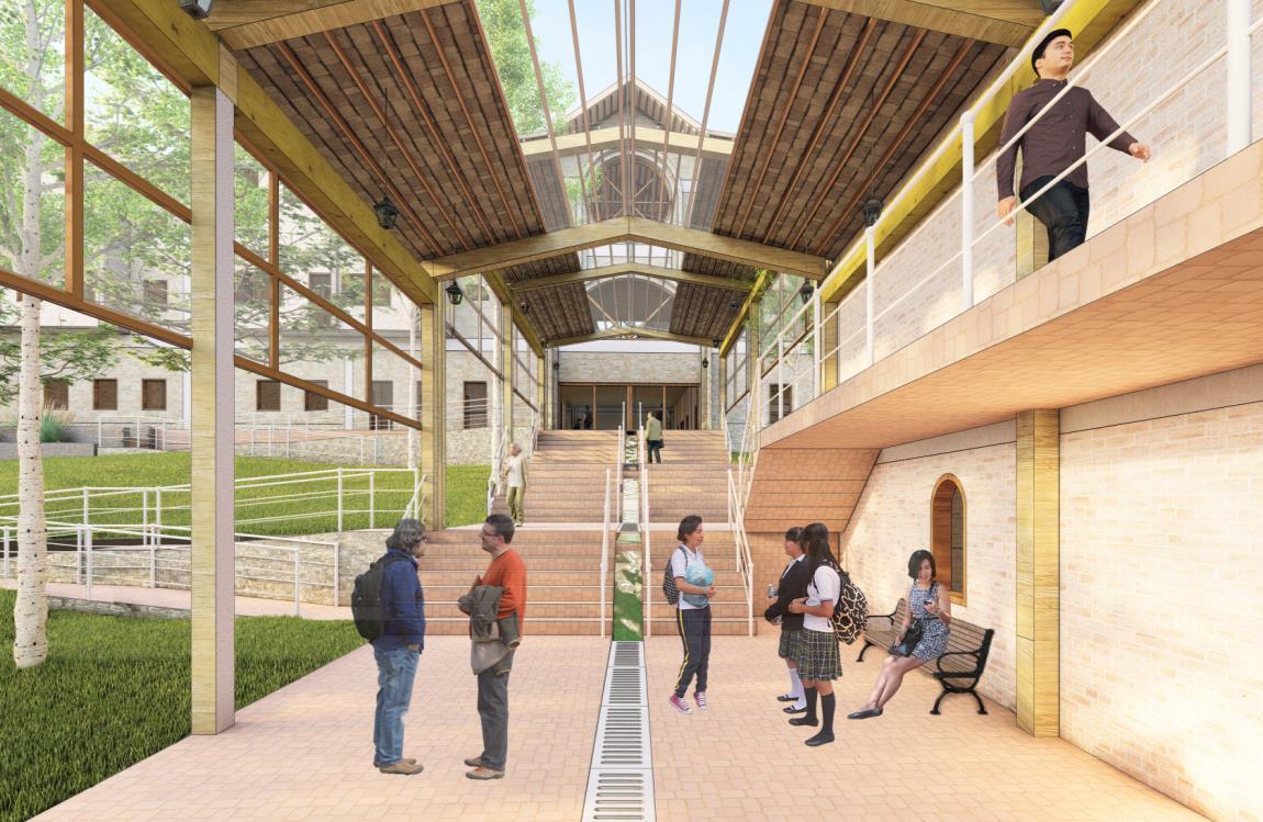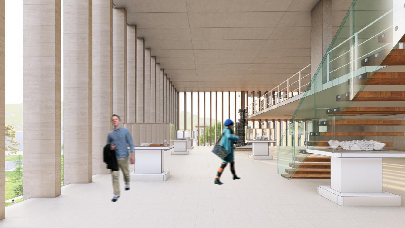 Además, el remate del patio interior del proyecto se transforma en una zona de exposiciones temporales, que guía hacia exposiciones permanentes y auditorio
