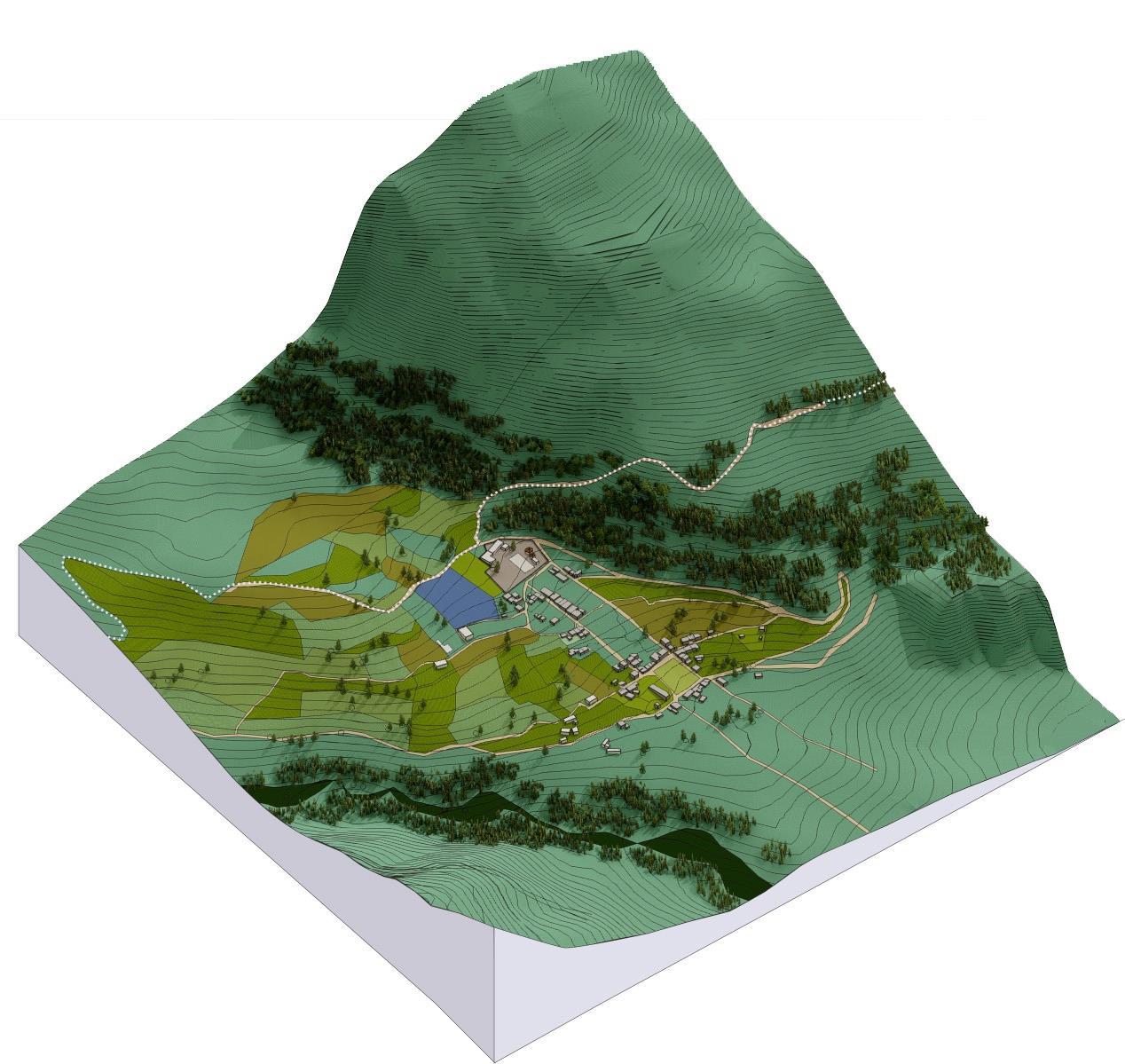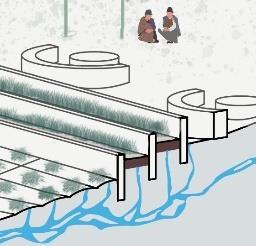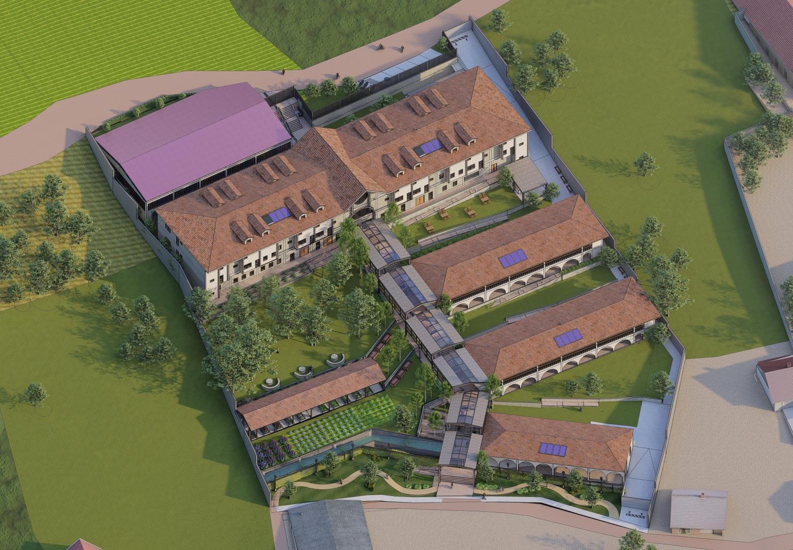 El proyecto incluye un acceso a un riachuelo en la parte superior, cuyo caudal se canalizó a través del eje principal para servir como sistema de riego principal.