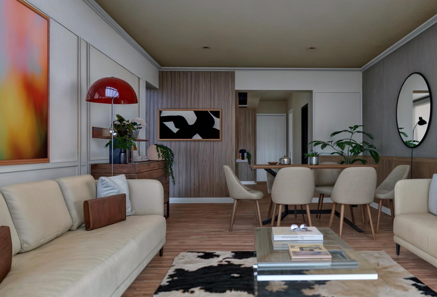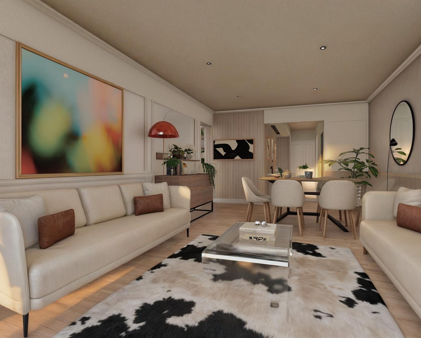 El corazón del departamento reside en la sala/comedor, espacio donde se jugó con texturas, colores tenues en mueblería y colores vibrantes en la decoración