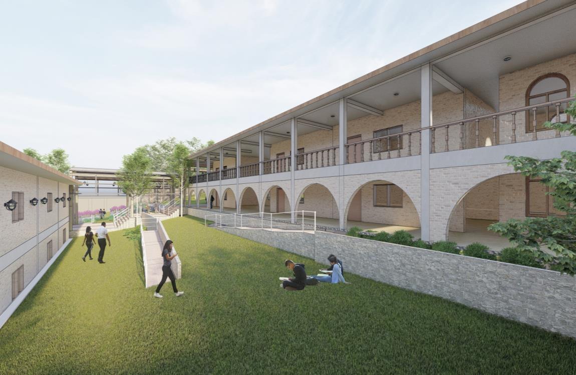 El hall central actúa como núcleo de conexión, enlazando todos los servicios comunes, la residencia, eje central y las aulas