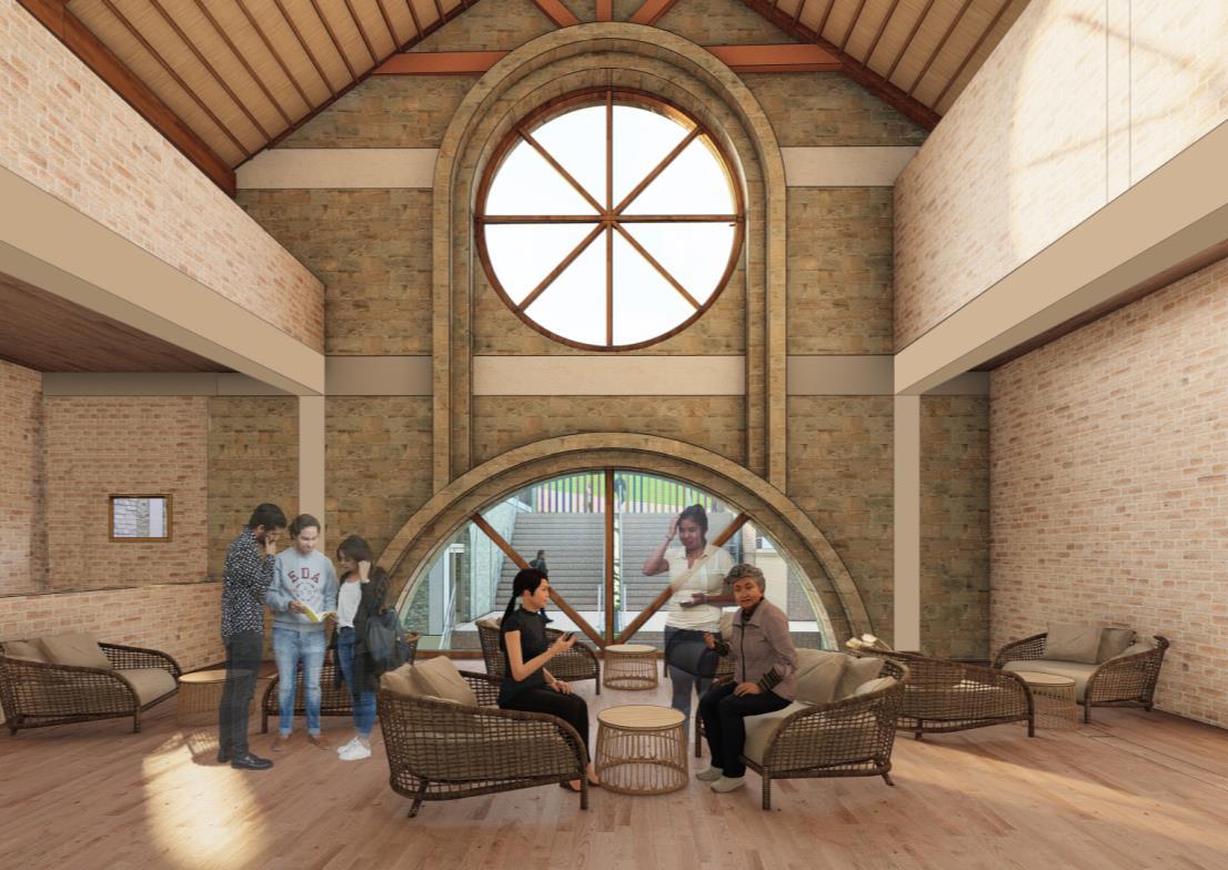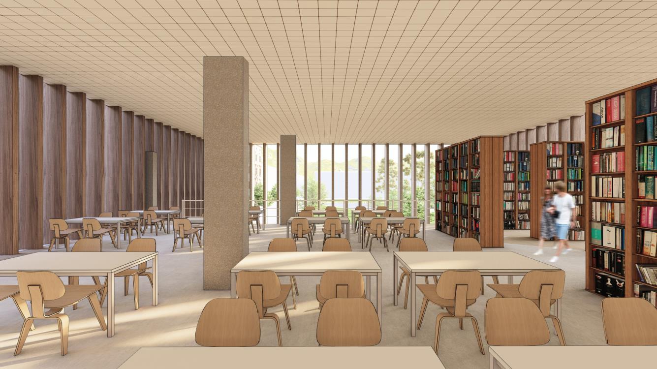 El diseño incluye salones sociales, salones de estudio y hall principal de doble altura que ofrecen vistas privilegiadas al eje principal, al bosque existente y al ingreso principal