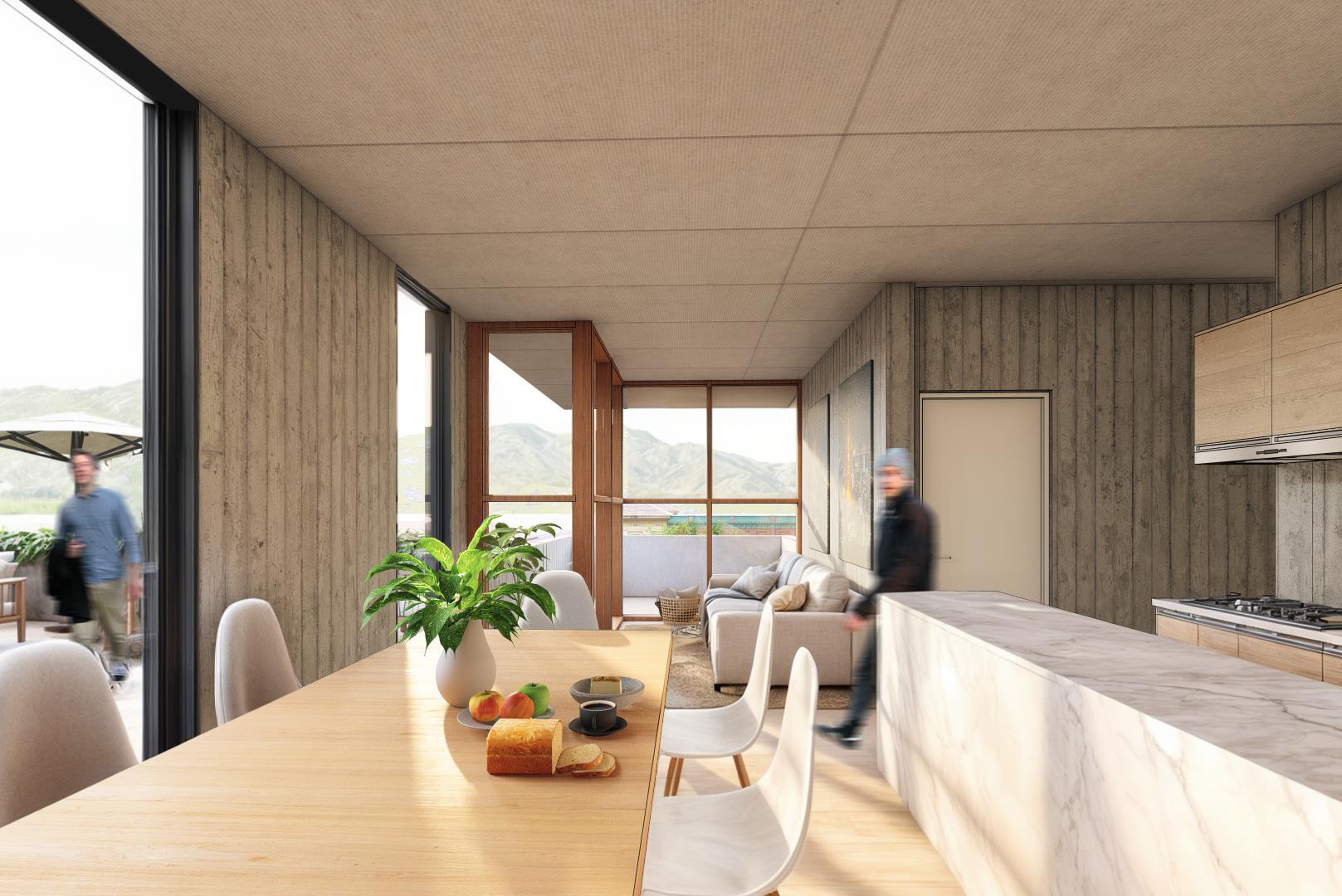 Espacios cuidadosamente iluminado, con acabados rústicos del mismo material creando una atmósfera acogedora y funcional.
