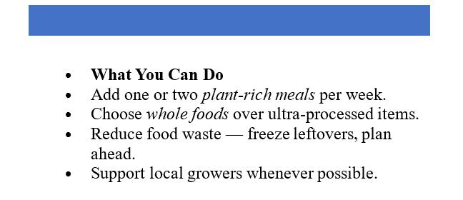 A shift toward a more plant-rich diet is one of the simplest, most impactful actions individuals and communities can take. It supports global food security, protects our environment, and leads to healthier lives.