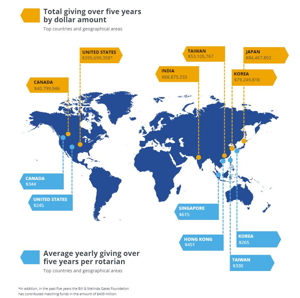 Looking back on this year, The Rotary Foundation accomplished a great deal, We renewed our determination to fight polio to the end. Rotary and its partners in the Global Polio Eradication Initiative are implementing a strategy to stop the transmission of all wild poliovirus in the endemic countries of Pakistan and Afghanistan and the circulation of vaccine-derived poliovirus in outbreak countries. Last October, Rotary, the Bill & Melinda Gates Foundation, and the global community collectively pledged $2.6 billion toward this plan.