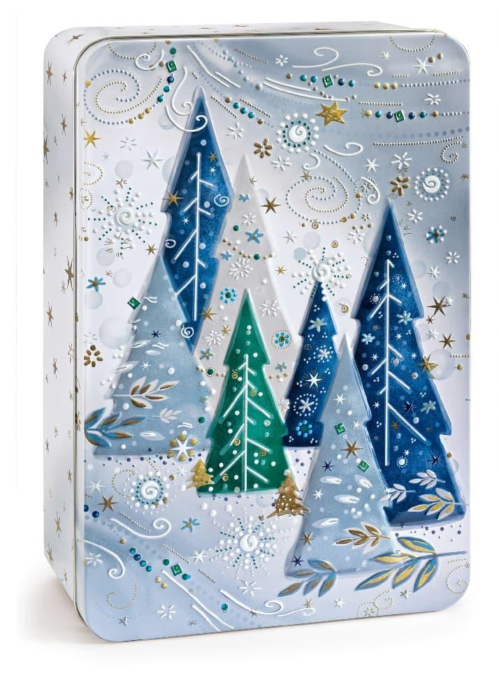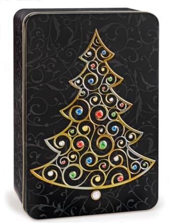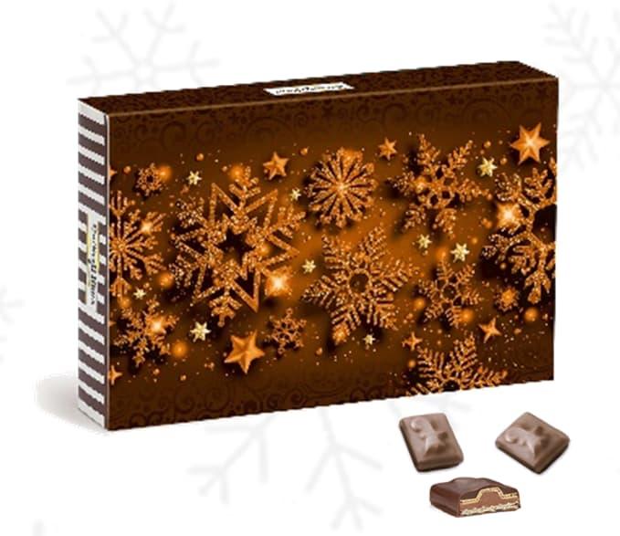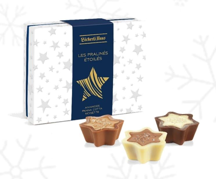 12 pralinés en forme d'étoile, fourrés de crème d'amande, de panna cotta et de crème de noisette, enrobés de chocolat au lait ou noir fondant. Le sucre blanc nacré complète harmonieusement cette expérience festive.
