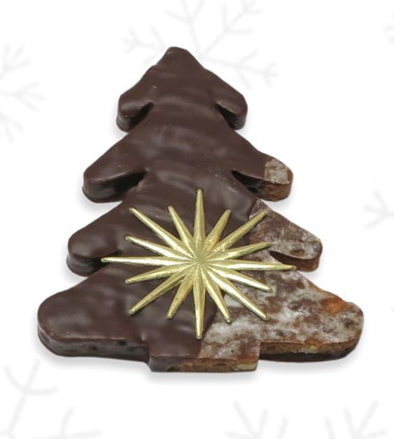 Chocolat au lait suisse croquant en forme de sapin, saupoudré d'éclats d'amandes grillées en guise d'aiguilles de sapin fantaisistes.
