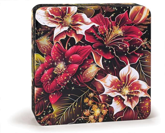 Un poinsettia magique avec un gianduja tendre et crémeux, enrobé de chocolat au lait suisse croquant et décoré de manière festive avec de l’or.