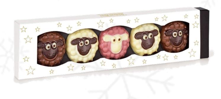 Alerte aux petits moutons pour Noël ! Dans leur emballage étoilé scintillant, Molly, Wolly et Dolly se présentent comme de doux petits moutons en chocolat dans trois variétés : Ruby/Panna Cotta, Blanc/Amande et Lait/Noix (5 pièces à 20g).