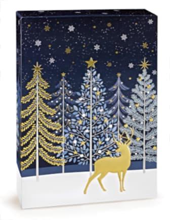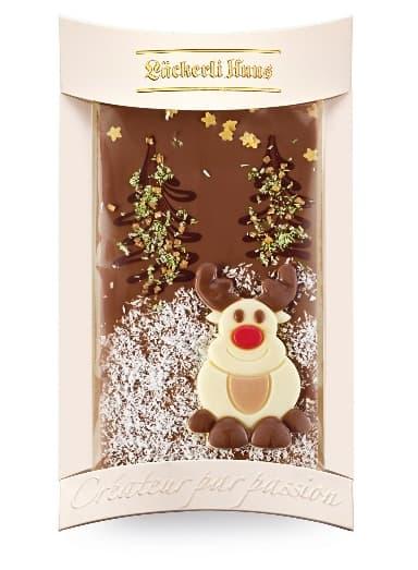 Chocolat au lait suisse décoré à la main d'un renne au repos dans un paysage hivernal -avec des sapins, un ciel étoilé, des paillettes et une base en coco blanche comme neige pour une ambiance festive.