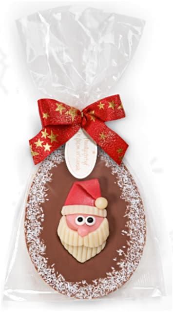 Le traditionnel Père Noël en tendre chocolat au lait suisse avec croquant aux noisettes, décoré à la main avec amour de chocolat blanc.