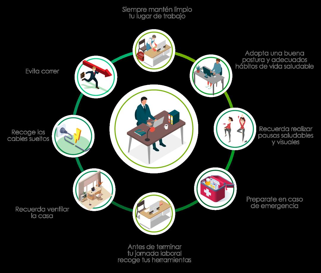 A continuación, se reseñan recomendaciones de SST para el trabajo remoto, las cuales propenden por el bienestar de los trabajadores remotos, la promoción de su salud, propender por entornos seguros de trabajo, promover su autocuidado y la prevención de accidentes de trabajo y enfermedades laborales.