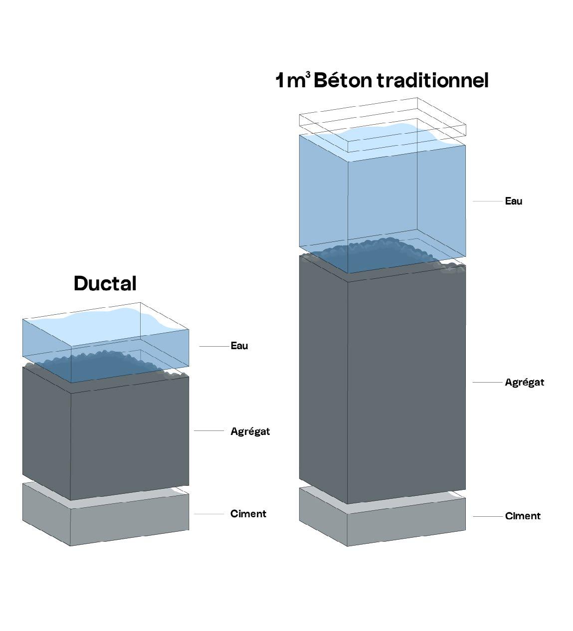 -Rapport eau/ciment réduit : Pour un volume d’eau de gâchage comparable, Ductal® a une teneur en ciment sensiblement supérieure aux bétons normaux et à haute résistance. En règle générale, il en résulte un rapport e/c nettement plus faible de moins de 0,25.