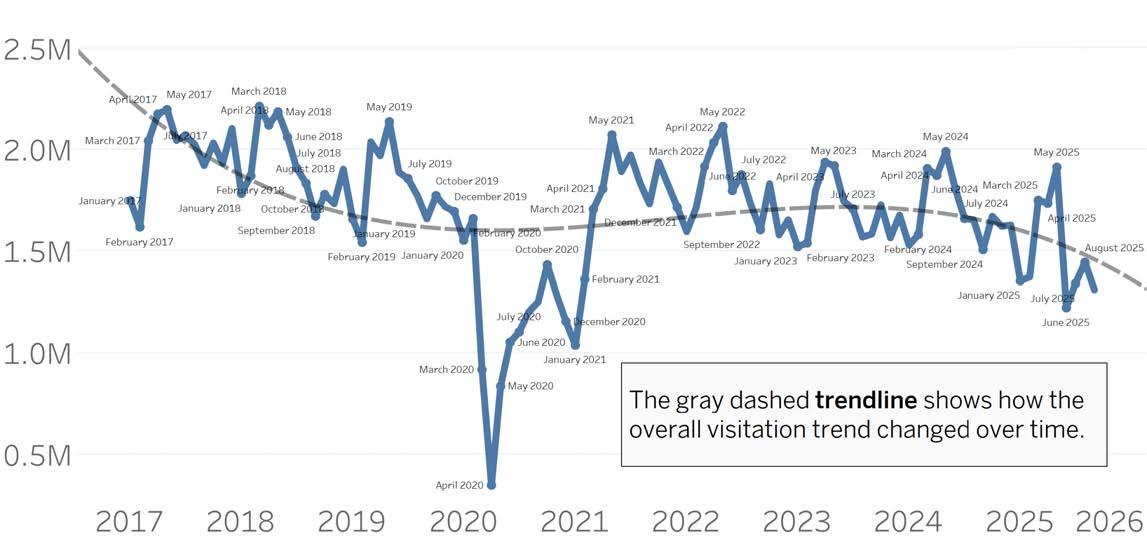 We are still subject to the global downward visitation trend. September 2025 had the lowest visitation of any September in recent years (1,310,355 visits), which is 13.1% lower than September 2024. August 2025 was down 12.7% vs. August 2024, and July 2025 was down 19.3% vs. July 2024. The decline slowed sharply after June (-32.3%) compared to June 2024.