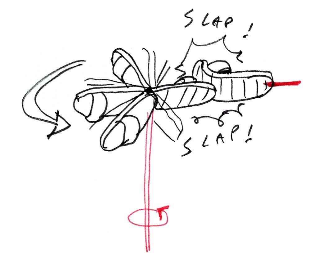 [E.C.] Talking about the importance of air in the work brings up the magical. You often mention the animation film Fantasia as a reference, and I think of the scene of the sorcerer’s apprentice, trying to emancipate from his master, at first joyfully taking control of a broom, and failing to tame it, eventually losing control: the broom multiplies and becomes a threatening army of brooms. I see a parallel with what you have described as a tension between the cute and comical aspect of the flipflop and its potential for violence. What is your take on this tension?