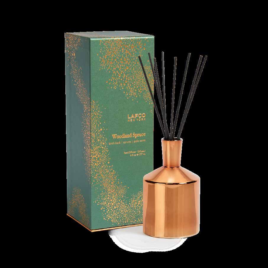 The festive aroma of an enchanted winter forest is created by combining the natural essence of fresh birch bark and crisp, evergreen spruce warmed with earthy palo santo wood. An invigorating holiday scent for a nostalgic ambiance.