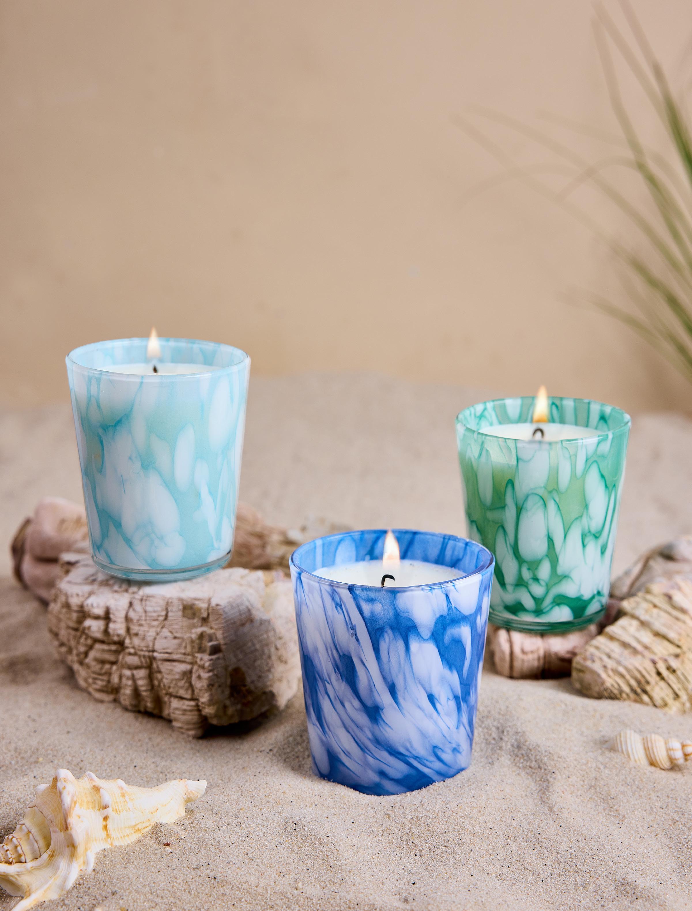 Enjoy our beloved coastal fragrances in three specialedition, 9.5 oz vessels with up to 60 hours of burn time. Watercolor-inspired glass echoes a striking, spirited seascape—while oceanic notes draw you in.