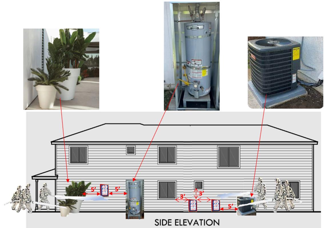 4.SurfacesofESSunit(s)tobenotlessthan3’fromthemainelectricalpanel.Provideaminimum5’ clearspaceoneachsideoftheESStoanyobstructionsthatextends18”beyondthewallsurface (rainbarrels,toolshed,a/cunits,hotwatertanks,etc…)toensurehosestreamaccess.
