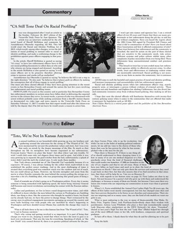 to occur. AB 953 aims to curb the harmful and unjust practice of racial and identity profiling, and increase transparency and accountability with law enforcement agencies. Racial and identity profiling occurs when law enforcement officers stop, search, property seize, or interrogate a person without evidence of criminal activity. These practices not only humiliate and frighten law abiding Californians, but also divert limited community resources away from evidence-based policing, thus making us all less safe. I hope that soon the elected officials will familiarize themselves with twenty-first century policing issues when it comes to the communities that are effected that make it necessary for legislation such as AB 953. Note: Clifton Harris is a retired peace officer and the publisher of the San Bernadino American News.