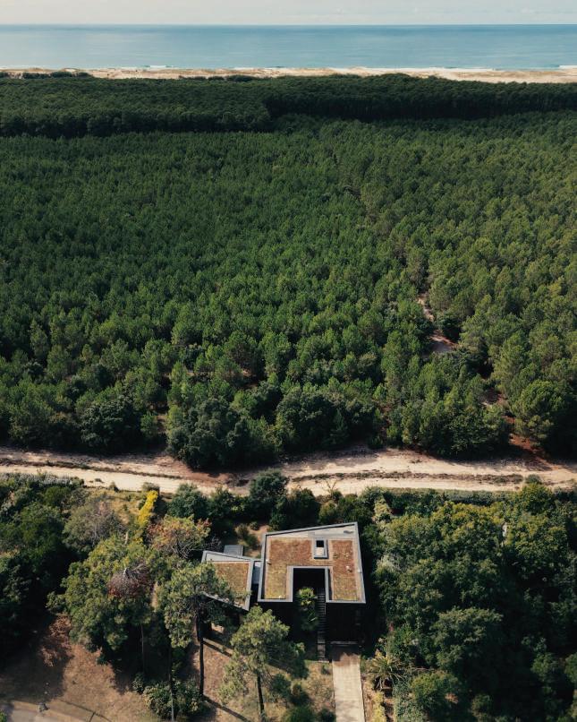 Dans les pinèdes, à deux pas de l’océan, une cabane suspendue s’insinue entre les arbres. Deux volumes en bois sombre, portés par des piliers, pour ne pas heurter le sol qu’ils effleurent à peine.