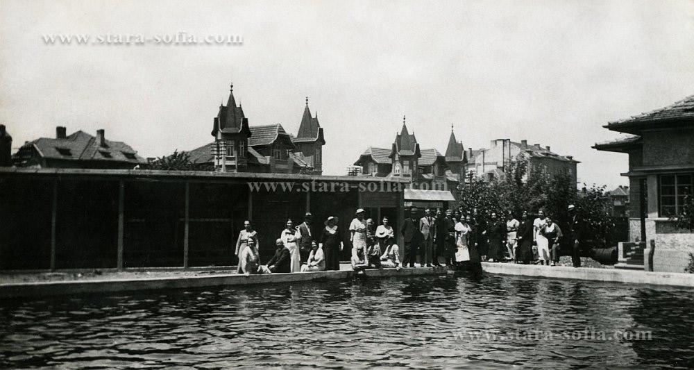 Училищни т басейн на „ Антим Първи“. Днес там е насто щата сграда на училището, където се помещава и Испанската гимнази На заден план се разпознават къщите близнаци на брат ли н и Иван Парушеви, дело на именити архитект Никола Лазаров от 1911 г На