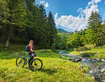 largely rewarded by the beauty of the surrounding rocky and wooded landscape. Beyond the crossroads for the Malga Lorina (21.8 km) and the waterfall of Prà di Lavino you will reach first the Malga Cà de l’Era and then the Malga Ciapa, beyond which there are three more bends to the Garda refuge on the Tremalzo Pass still have to climb a bit more to reach the Bocca di Val Marza, where a tunnel marks the high- est point of the itinerary (1865 m ASL). The road that follows, which dates back to World War I along with shelters and observation points carved in the rock, is spectacular and fun, and goes down connecting to the one rising from the valley of Bondo. From here you follow the signposts for the Nota pass (38.4 km, 1208 m ASL), the Bestana pass (1274 m ASL) and the Segala hut. Not far from this, near the Guil pass, turn right onto path no. 117, which with a series of technical challenges leads down to the Singol valley, along which we descend returning to the village of Limone sul Garda.