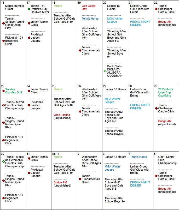 Please note: The clubhouse dining and bar service will be closed on March14fortheannualMen’sMember-Guestevent.