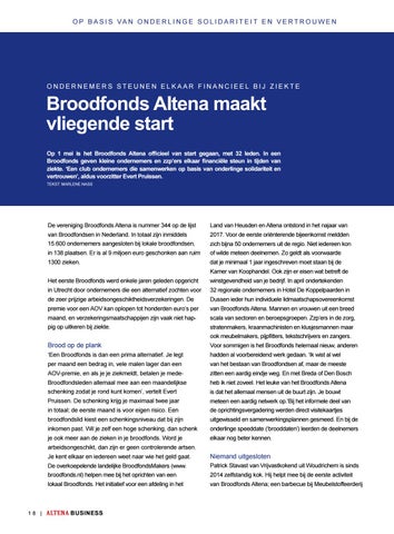 Broodfonds Altena maakt vliegende start Op 1 mei is het Broodfonds Altena officieel van start gegaan, met 32 leden. In een Broodfonds geven kleine ondernemers en zzp’ers elkaar financiële steun in tijden van ziekte. ‘Een club ondernemers die samenwerken op basis van onderlinge solidariteit en vertrouwen’, aldus voorzitter Evert Pruissen. tekst: marlene nass