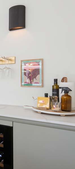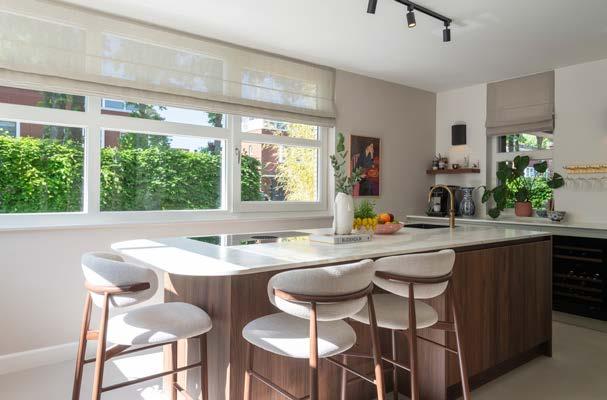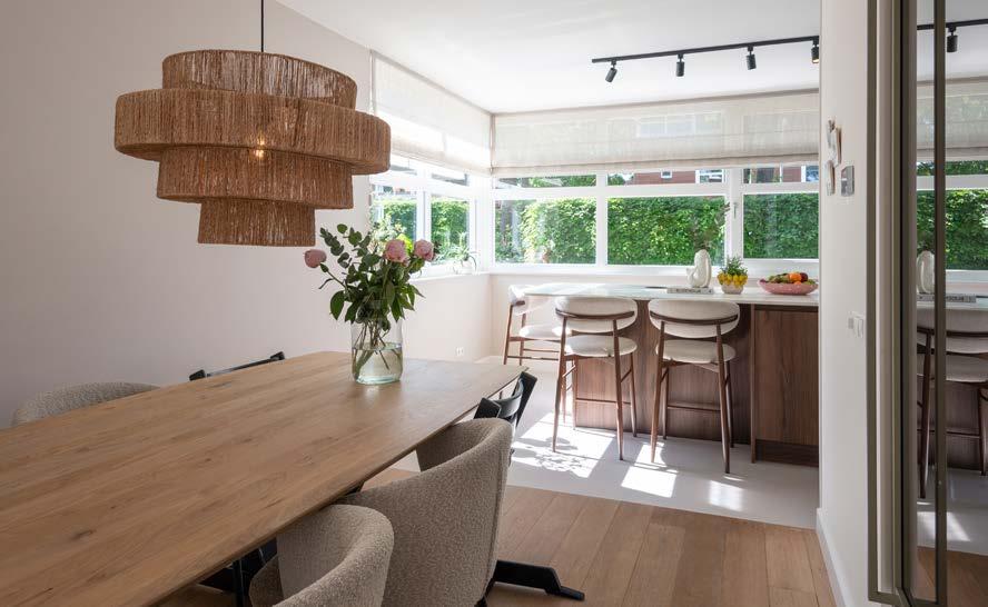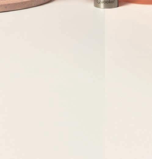 Lang, naadloos en stijlvol Komt nog bij dat deze bladen in hele lange lengtes gemaakt kunnen worden. Waar een keukenblad uit één stuk bij ruim drie meter wel ophoudt, kunnen de bladen van Evolve makkelijk voorbij de vier meter. Het keukenblad wordt gegoten als één geheel, waardoor je geen naden krijgt. Door het om en om dichte karakter voelt het blad heel massief aan. En, niet onbelangrijk, de keukenkoper kan kiezen uit een fraai kleurenpalet, uiteenlopend van beige, offwhite en crème tot wat je maar wilt. Keukenliefhebbers die na het lezen van dit artikel nieuwsgierig zijn geworden, zouden eigenlijk eens bij Ankie in de showroom moeten gaan kijken. In haar demoruimte heeft ze een knappe knoeperd van zo’n keukenblad staan — drieënhalve meter lang, een meter twintig diep en vier centimeter hoog. En hé, dit blad is voorzien van ronde hoeken. Echt waar. Het geheel krijgt daardoor een zachte, uitnodigende en ontspannen sfeer. Ronde vormen doorbreken de strakke lijnen van rechte meubels en creëren een gevoel van harmonie en evenwicht.
