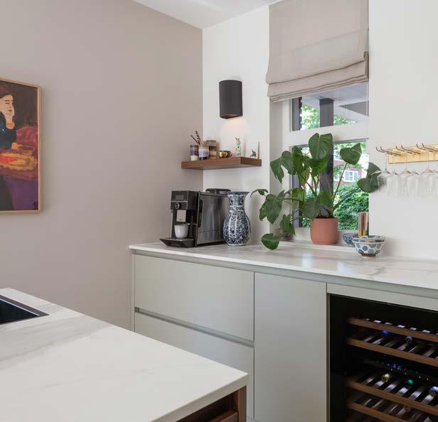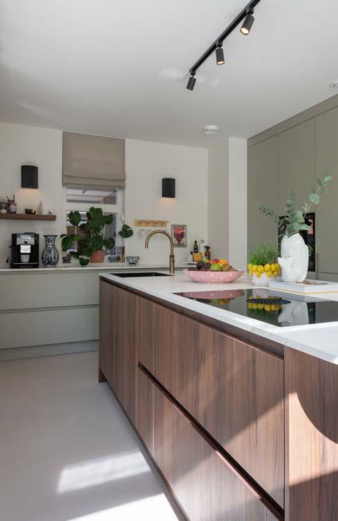 Maar die nieuwe woning kende één nadeel: de keuken. Matthew: “Die kon niet tippen aan de keuken die Ankie in onze vorige woning had gemaakt. Dus wij weer terug naar Puur Keukens om Ankie een nieuwe te laten tekenen. Zij kan dat als geen ander. Ze voelt precies aan wat je wilt, maar bedenkt er dan dingen bij waar je zelf nooit op was gekomen. We hebben nu een eiland in walnoten, een extra groot aanrecht en sagegroene kasten. Wat erin stond paste qua kleur en opzet niet bij ons.”