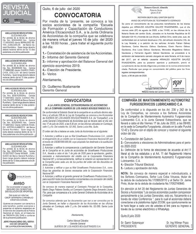 TRANSPORTE “SUTAXI” C.A , convoca con carácter obligatorio a los señores accionistas a la JUNTA GENERAL EXTRAORDINARIA a realizarse el día jueves 20 de noviembre del 2025 a las 18 horas (6 p.m.) en su oficina ubicada en las calles Rafael Sánchez 2-72 y Rafael Larrea Andrade se tratara el siguiente orden del día: