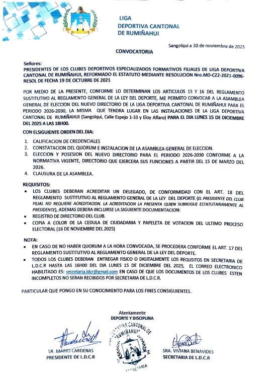 POR MEDIO DE LA PRESENTE, CONFORME LO DETERMINAN LOS ARTICULOS 15 Y 16 DEL REGLAMENTO SUSTITUTIVO AL REGLAMENTO GENERAL DE LA LEY DEL DEPORTE, ME PERMITO CONVOCAR A LA ASAMBLEA GENERAL DE ELECCION DEL NUEVO DIRECTORIO DE LA LIGA DEPORTIVA CANTONAL DE RUMIÑAHUI PARA EL PERIODO 2026-2030, LA MISMA QUE TENDRA LUGAR EN LAS INSTALACIONES DE LA LIGA DEPORTIVA PARA EL DIA LUNES 15 DE