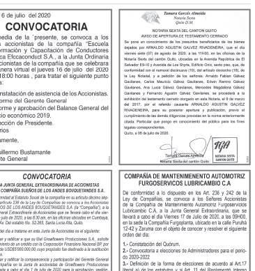 TRANSPORTE “SUTAXI” C.A , convoca con carácter obligatorio a los señores accionistas a la JUNTA GENERAL EXTRAORDINARIA a realizarse el día jueves 11 de diciembre del 2025 a las 18 horas (6 p.m.) en su oficina ubicada en las calles Rafael Sánchez 2-72 y Rafael Larrea Andrade se tratara el siguiente orden del día: