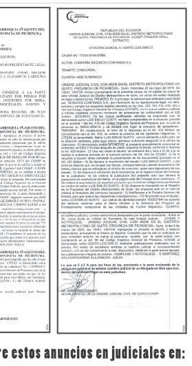 JUEZ DE LA CAUSA.- Abg. Placido Isaías Mendoza Loor Juez de la Unidad Judicial Civil de Manta, en auto de fecha Manta, miércoles 18 de enero del 2023, a las 08h12, aceptó la demanda al trámite mediante procedimiento ordinario; y dispuso que a los demandados CESAR SANTIAGO ESPINEL PÉREZ Y POSIBLES INTERESADOS, se los cite por medio de la prensa al tenor del Artículo 56 numeral del Código Orgánico General de Procesos, mediante publicaciones del extracto de la demanda, auto inicial, escrito de aclaración y completitud y de este auto de calificación, que se harán en tres fechas distintas en un periódico de amplia circulación de la ciudad de Quito y en otro periódico de amplia circulación de esta ciudad de Manta. Conforme a lo dispuesto en el artículo 291 del Código Orgánico General de Procesos, se concede a los demandados el término de TREINTA (30) DÍAS, para que contesten la demanda en la forma establecida en el artículo 151 del mismo cuerpo normativo; transcurridos veinte días desde la última publicación empezará el término para contestar la demanda. Manta, mayo 18 de 2023.