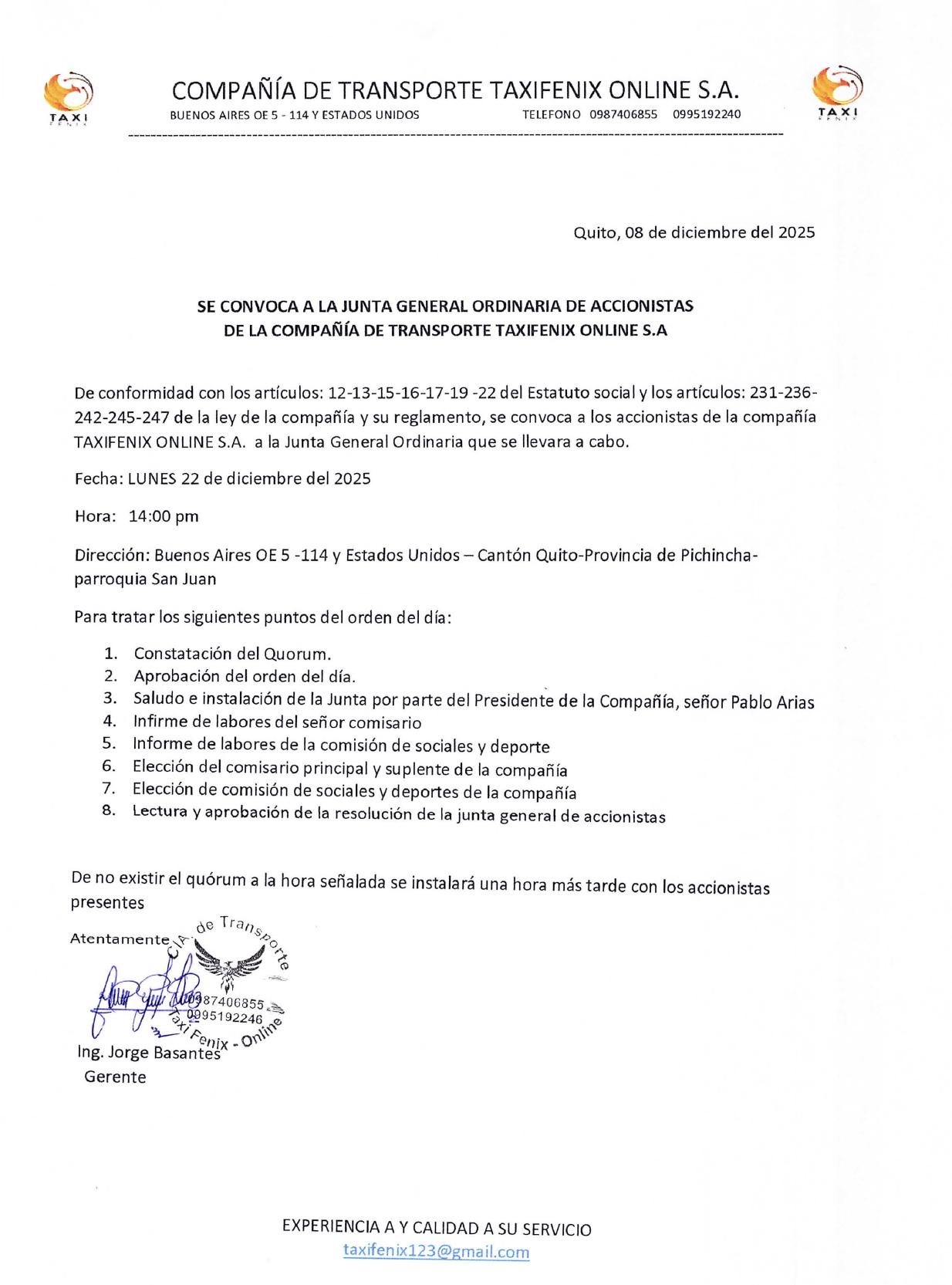 TRANSPORTE “SUTAXI” C.A, convoca con carácter obligatorio a los señores accionistas a la JUNTA GENERAL ORDINARIA a realizarse el jueves 18 de diciembre del 2025 a las 18 horas (6 p.m.) en su oficina ubicada en las calles Rafael Sánchez 2-72 y Rafael Larrea Andrade se tratará el siguiente orden del día.