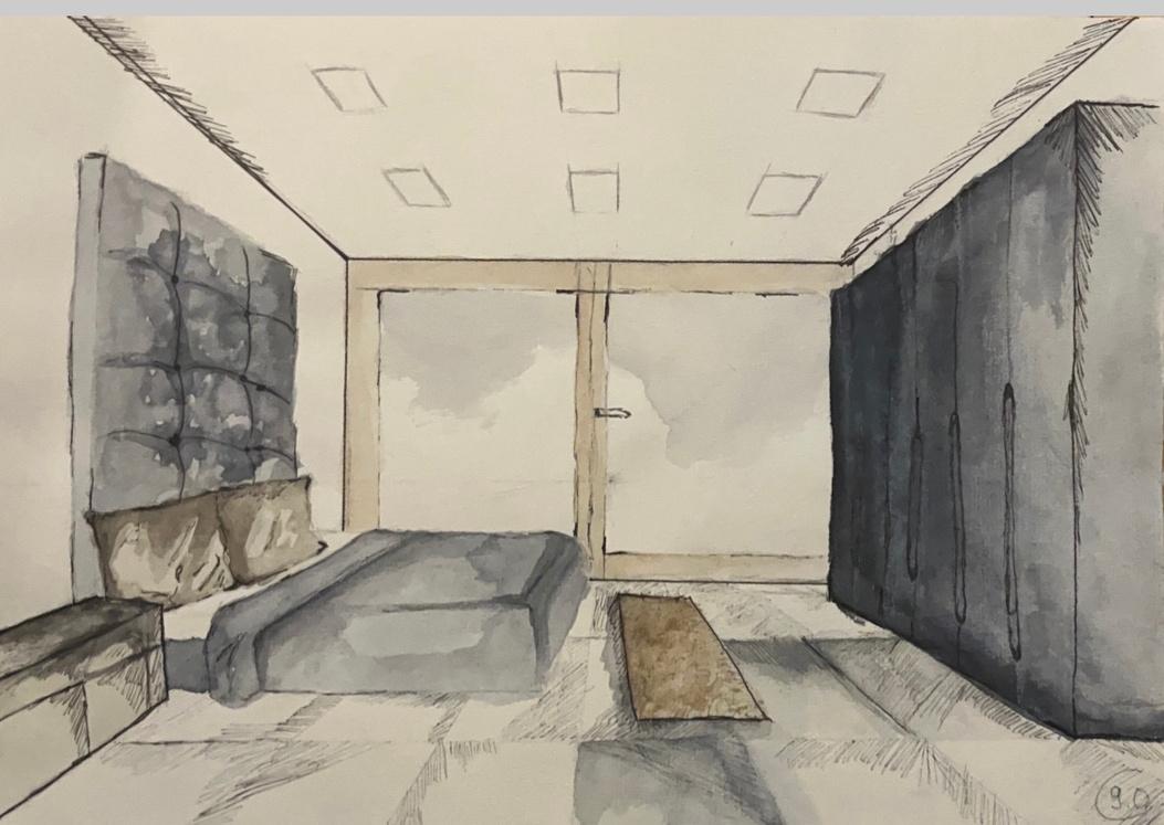 Interior perspective rendered in markers. (Markers / Watercolors - Paper size: 2xA4)