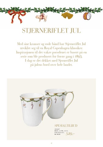 Stjerneriflet JUL Med sine kranser og røde bånd har Stjerneriflet Jul utviklet seg til en Royal Copenhagen klassiker. Inspirasjonen til det vakre porselenet er basert på en serie som ble produsert for første gang i 1895. I dag er det dekket med Sjerneriflet Jul på julens bord over hele landet.