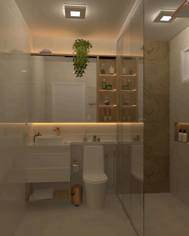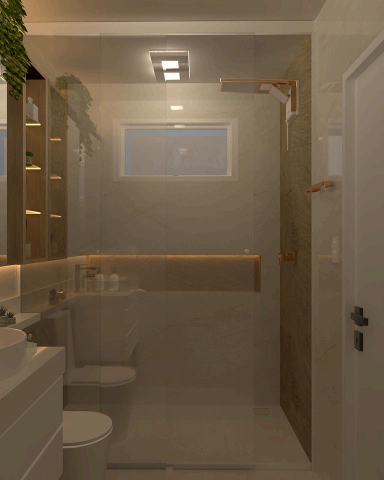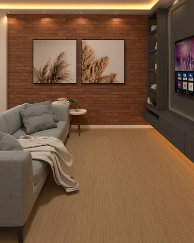 Os elementos adotados equilibram funcionalidade e conforto. O uso de revestimentos com texturas naturais, como porcelanato que remete à madeira, traz um toque de elegância e aconchego.