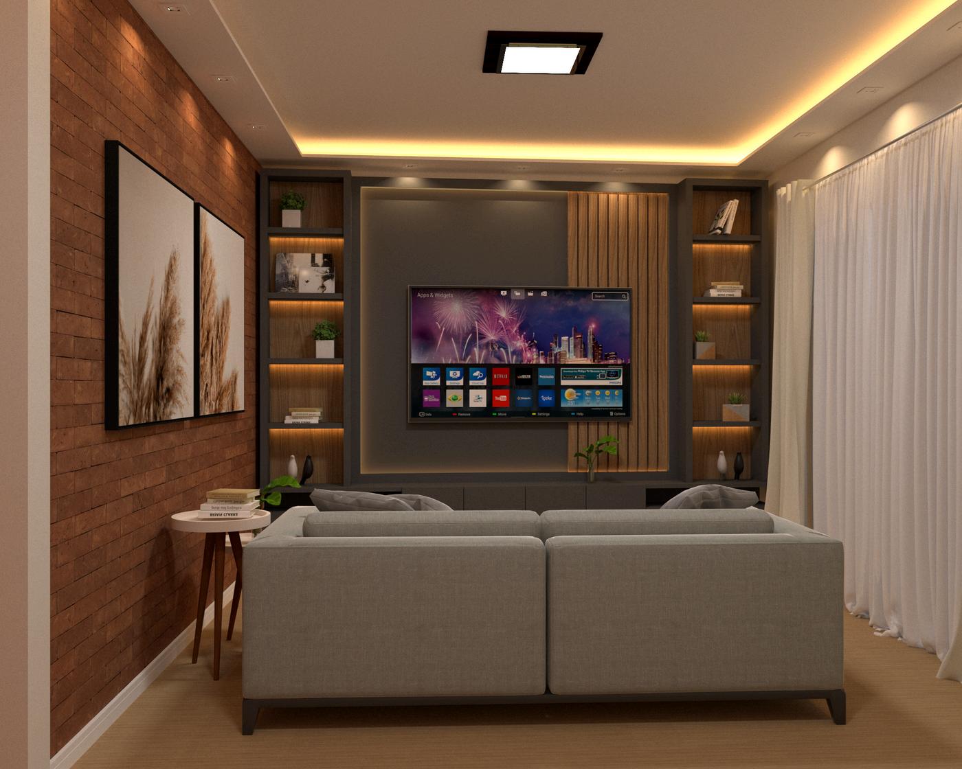Na sala, foram escolhidos cuidadosamente elementos que evocam aconchego e conforto. A combinação da paleta de cores, materiais naturais e a iluminação bem distribuída reforçam a sensação de bem-estar.